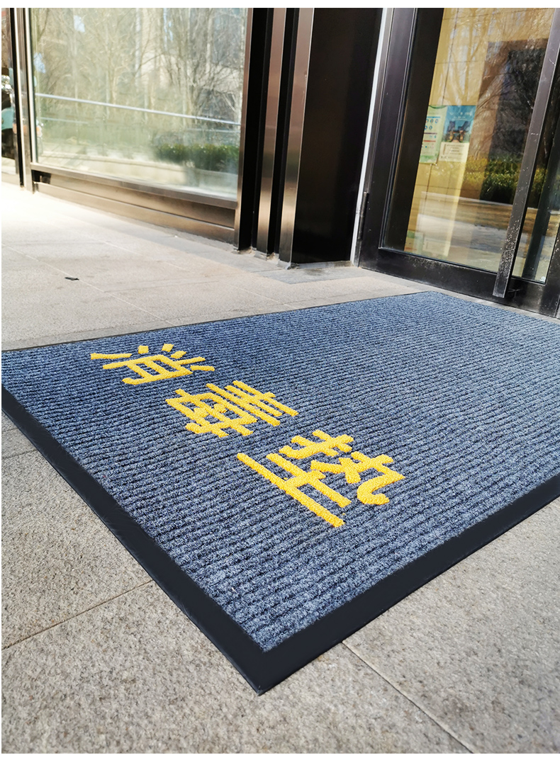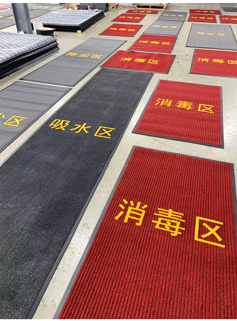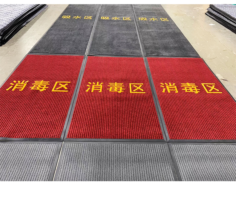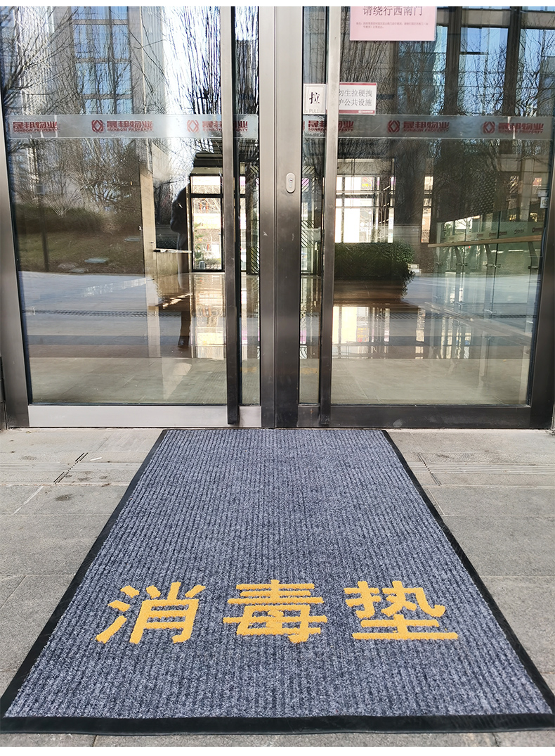 在入口的室内,通过一张浸湿84消毒液的 消毒地垫和一张干爽的吸水地垫,组成 “消毒+吸水”组合。入场客人首先躍到